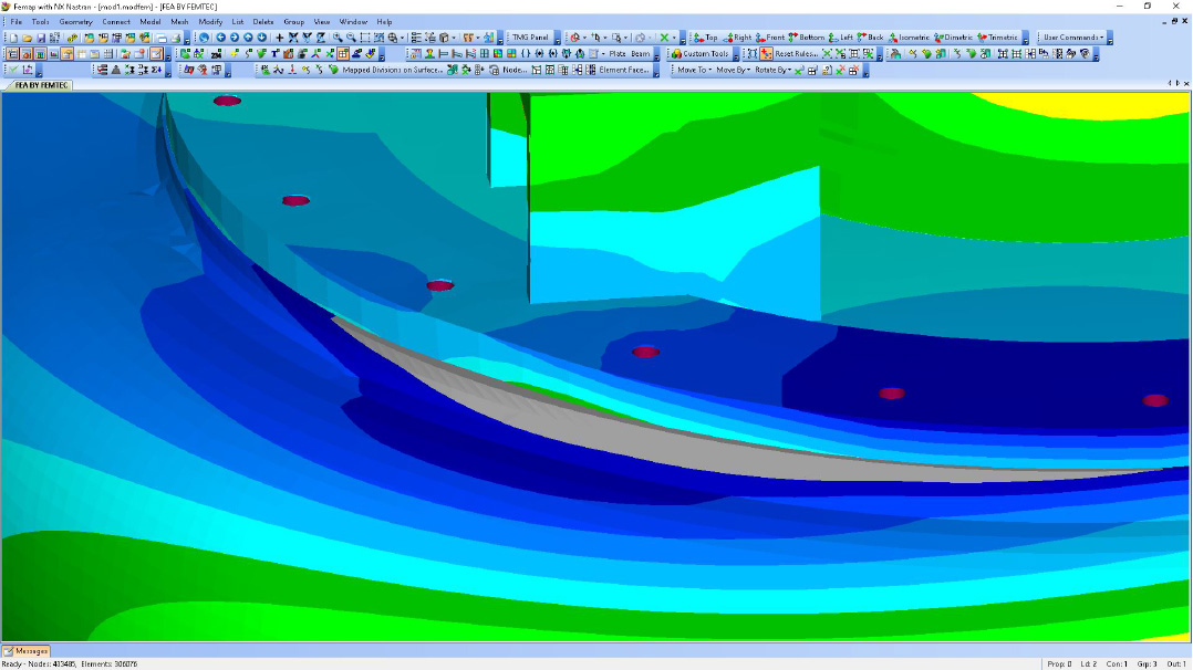 Designs may allow ‘large displacements’ of their parts and with that void one of the prerequisites for linear analysis. These large displacements may cause loads applied to the non-deformed geometry to differ significantly from those occurring after the design was deformed by that (or some other) load. The geometry and loads applied need to be updated during the analysis. At Femtec we possess the experience and mechanical insight to ensure correct load application to our models, constantly bearing possible geometric non-linearity in mind.